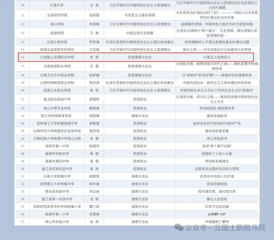李赟老师教案《以琢玉之技铸匠心》入选2025年云南省学校思政课优秀教案