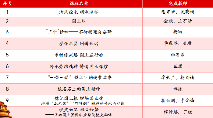 “土课”是学校既接地气又鲜活的思政课的国土特色案例,是思政课程和课程思政的有机结合,既有思政课程培根铸魂的元素,又有课程思政同向同行的元素;既有思政课程立德树人的内容,又有学校典型特色的内容。“土课”的建设目标是将“土课”建成服务学校思政课、人文教育、对外宣传、指导学生工作的国土特色案例。