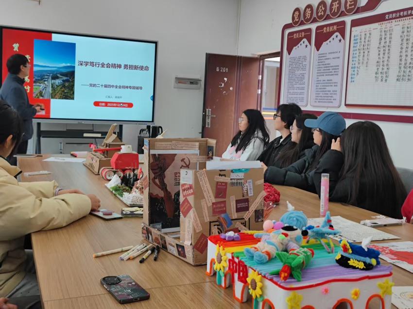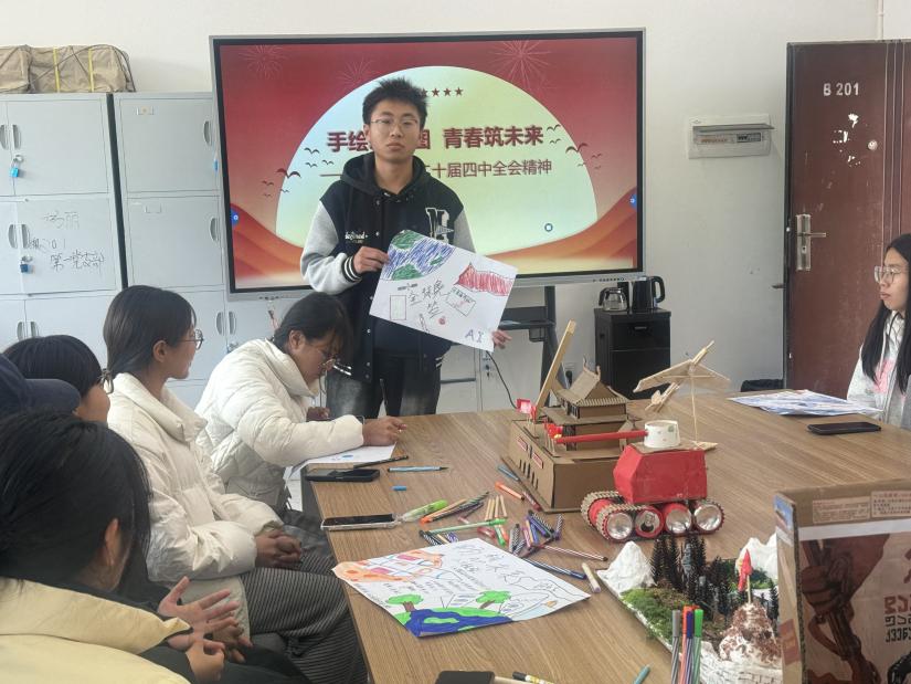 为深入学习贯彻党的二十届四中全会精神,凝聚青年力量,号召广大学子“立报国强国大志向 做挺膺担当奋斗者”,马克思主义学院于12月24日举办“手绘新蓝图 青春筑未来”师生座谈会。师生代表通过理论学习与创意实践相结合的形式,共话青年使命,共谋青春担当。