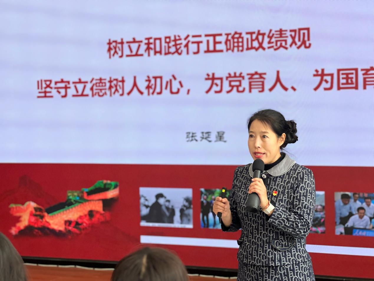 校党委委员、马克思主义学院院长张延星以“树立和践行正确政绩观”为主题作专题领学。她从“政绩为谁而树、树什么样的政绩、靠什么树政绩”三个维度,结合高校教育工作实际,为全体教师带来一堂理论扎实、内涵丰富的辅导课,引导大家将正确政绩观融入教书育人全过程,以立德树人实效检验工作成效。